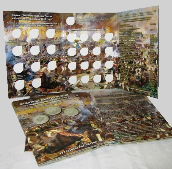 2 — руб. монет серии «ПОЛКОВОДЦЫ И ГЕРОИ ОВ 1812 года» + "Эмблема празднования 200 летия победы в войне 1812 года" (17 монет), 5 — руб. «СРАЖЕНИЯ И ЗНАМЕНИТЫЕ СОБЫТИЯ ОВ 1812 года и ЗАГРАНИЧНЫХ ПОХОДОВ РУССКОЙ АРМИИ 1813–1814 годов» (10 монет), 10 -руб. монеты 200-летие победы России в ОВ 1812 года . (1 монета) ИТОГО: 28 монет. КАЖДАЯ ЯЧЕЙКА ПРЕДНАЗНАЧЕНА ДЛЯ ХРАНЕНИЯ ОПРЕДЕЛЕННОЙ МОНЕТЫ (все ячейки подписаны). Ячейки для монет изготовлены из картона. Монеты видны с обеих сторон. На последней странице присутствует описание всех монет данной серии. Альбом-КНИГА изготовлена из материалов не содержащих вредных для монет компонентов!!! Монеты вставляются в ячейки и закрываются пластиковыми вставками, которые входят в комплект к альбому. Цена альбома 700 рублей оплата: КОНТАКТ. Золотая корона Почтовый перевод. Карта сбербанка. Яндекс деньги+5% Qiwi кошелёк +5% Пересыл: 1 альбома 100 рублей, далее по тарифам почты Все остальные темы с альбомами и монетами тут: http://www.reviewdetector.ru/index.php?showtopic=613194&hl= http://www.reviewdetector.ru/index.php?showtopic=607662&hl= http://www.reviewdetector.ru/index.php?showtopic=606812&hl= http://www.reviewdetector.ru/index.php?showtopic=606794&hl= http://www.reviewdetector.ru/index.php?showtopic=635867&hl= Сообщение отредактировано sawara: Dec 20 2013, 22:48 Вложенные эскизы изображений |