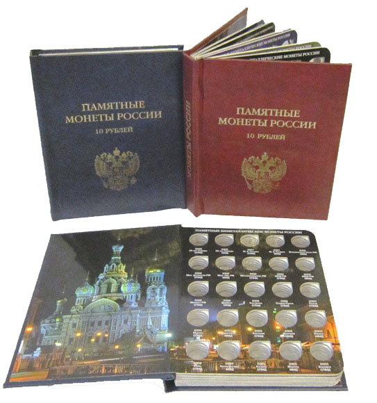 Альбом-книга предназначена для хранения ПОЛНОГО набора 10-рублевых биметаллических монет России, ВКЛЮЧАЯ 2013 год (представлены оба монетных двора). (100 ячеек)