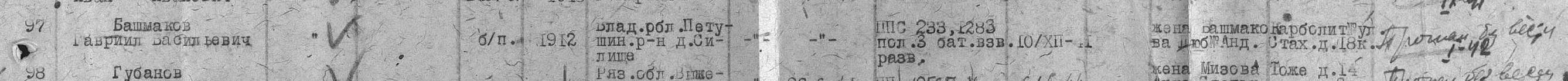 QUOTE(dimadeart @ Oct 7 2013, 13:51) Около месяца назад, около д. Нижняя Вязовня, были подняты останки 12 бойцов. При полном боекомплекте. Тела были по одному, два человека в воронках. Радиус поиска 70-10 метров. По данному направлению наступала 60 СД. Точней, 1283 полк. Между воронок была найдена коробочка (возможно, зажигалка) с надписью "Башмаков Г.В." По поиску "Мемориала", Башмаков Гавриил Васильевич 1912 гр. служил во взводе разведки, 3 бат, 1283 полк. Совподение по всем данным. Призывался Орехово-Зуевским военкоматом. Проживал в п.Карболит, ул.Стаханова, д.18 Не знаю, кто из 12 бойцов именно этот солдат, но один из них точно он. В любом случае, на братской могиле будет стоять его имя. Уважаемые коллеги! Прошу оказать помощь, особенно жителей Орехово-Зуево в поиске родственников. Есть списки однофамильцев проживающий в самом городе и районе, с адресами, но без телефонов. К слову Военкомат г.Орехово-Зуево отказал в помощи. Привет! Живу в Орехово-Зуево. Скинь адреса, попробую пробить. отправил сообщение Командиру Ореховского ПО, жду звонка. Сообщение отредактировано ст.матрос: Oct 7 2013, 13:43 -------------------- Кто не уважает прошлое, тот лишен будущего!