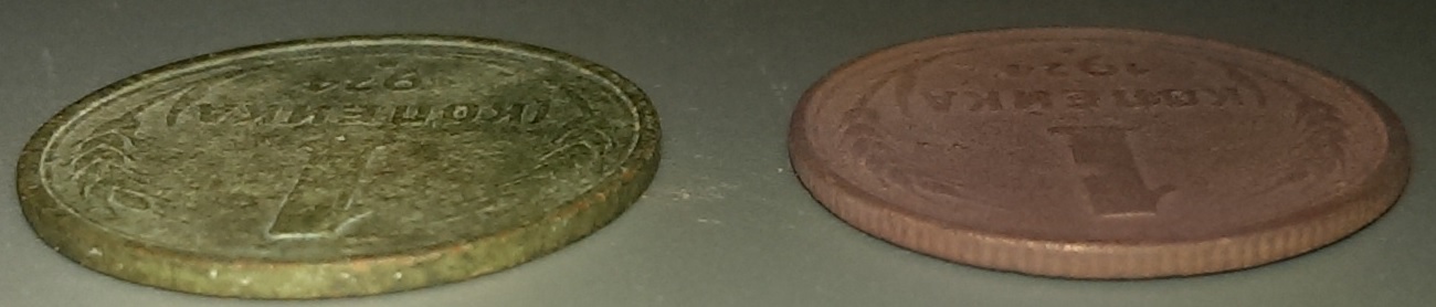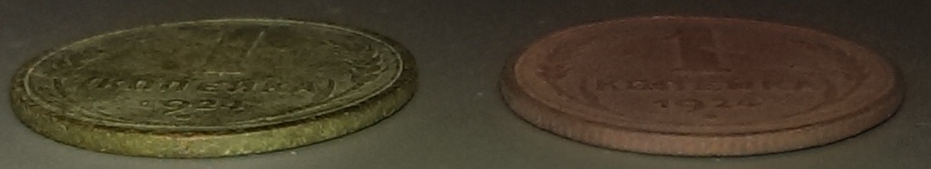 Если не сложно, будте добры дать свою оценку стоимости по этим двум монетам! На монете 1 копейка 1924 года (гурт гладкий) рубцов на полях нет, найдена она была в песчанике, поэтому такая расцветка из-за чего может плохо быть виден реверс. Монета 1 копейка 1925 года (гурт рубчатый) найдена так же в песчанике. Монеты мылись водой с мылом и не более. Спасибо! 1 копейка 1924 года. Вложенные эскизы изображений |