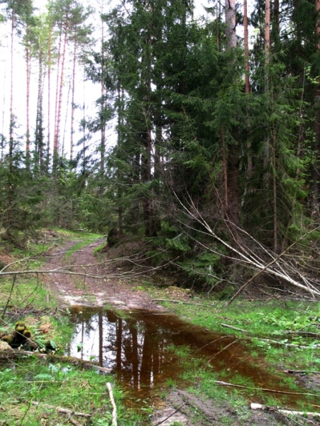 Мы прежним курсом месим сапогами раскисшую от влаги дорожную грязь, шлепаем в низинах по застоялой воде разлившихся луж, почему-то цвета крепкого чая. Глядишь на такие лужи и создается впечатление, что кто-то усердно сидел и окунал в каждую из них пакетики «Липтона», до тех пор, пока не растворится в воде весь краситель. Идем дальше. Знакомые пейзажи приветливо провожают до самого леса. Включаю прибор прямо здесь, на лесной дороге при входе в лес, которую в прошлом году уже тараканил Костин «Трезор». Тарелка МД внимательно ощупывает каждую неровность, равномерно скользит над колеей, как можно ближе прижимаясь к земле, жадно всхлипывает. Тут на дороге, вдалеке от заветной поляны земля подзамусорена: гайки, болты, алюминиевая проволока, почему-то обертка от презерватива. Метров сто и мусора становится значительно меньше, еще полста шагов и он исчезает, становится даже как-то не по себе, сразу накрывает паническое ощущение оторванности от благ цивилизации. Наконец первый за сегодня «благородный» сигнал и в руке лежат 2 николаевских луидора, метров через тридцать еще «николашка». Дальнейший путь хоть и не часто, но радует потеряшками 19 века, среди которых попадается и пару серебряных. Бросается в глаза, что монет 18 века на дороге не попадается, выходит, в 18 веке в село ходили другим путем, этот нарисовался значительно позже. Наконец между деревьев появились просветы знакомой вырубки, а значит, до урочища подать рукой. Лет 5 назад упыри-лесорубы выгрызли в позеленевшем топографическом безмолвии местных лесов очередную крысиную дыру, выгрызли в том самом месте, где в старину находился погост и где, судя по всему, нашли свое последнее пристанище жители канувшей в лету деревни. Когда-то в детстве, когда я еще и духом не ведал о том, что здесь было, мирно прогуливался по заросшему лесом погосту, не переставал удивляться тому, как земля здесь, сплошь была покрыта непроницаемым ковром ландышей, которые каждую весну как рассыпавшимся жемчугом, устилали белыми цветами лес. Летом нередко попадалась здесь и клубника. С удивлением я срывал крупные спелые ягоды и, откусывая, понимал, что они тут крупнее и вкуснее тех, что росли на моей фазенде. Теперь вырубка пообросла мелколесьем, припушилась колючим малинником, да ежевельничком. Ряд высоких сосен теперь массивно возвышался над корявой, уродливой порослью вырубки и залитые солнечным светом, они горделиво смотрели сверху на двух плетущихся захудалой лесной дорогой полоумных путников. В завершении вырубки дорога нырнула в низину «потока», сразу за ним поляна, где лесная дорога раздваивается и разбегается в разные стороны. На заметном возвышении, между расходящимися дорогами до конца 18 века стояла деревянная церковь, от которой осталась одна огромного размера яма. На еще одну огромную яму метрах в двухстах от поляны я наткнулся случайно, продираясь сквозь несказанной очертенелости бурелом. Запущенная в каждую из них минелабовская ящейка с дотошностью криминалиста осматривает каждый квадратный сантиметр поверхности, шурша прошлогодней листвой, принюхивается к стенкам, ныряет в грязные лужи, но все тщетно, ямы остаются безмолвными. Зато поляна продолжает радовать нас новыми потеряшками. Она буквально напичкана монетами 17-18 века. В карман летит чешуя Алексея Михайловича, копейки Петра, деньгИ 