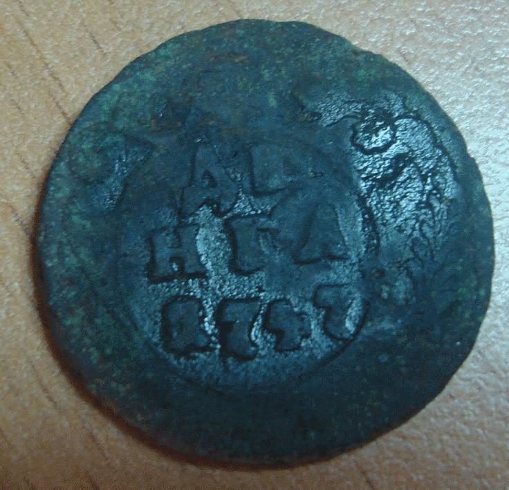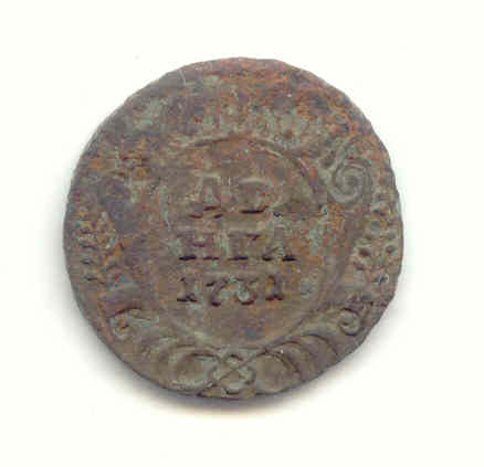 Попадались людям экземпляры денги без черты разных лет. Здесь как-то обсуждалась такая же деньга 1735 года.Разброс мнений-от разновидности до штемпельного брака и коррозии. Судя по фото, в этом случае можно предполагать тоже самое....