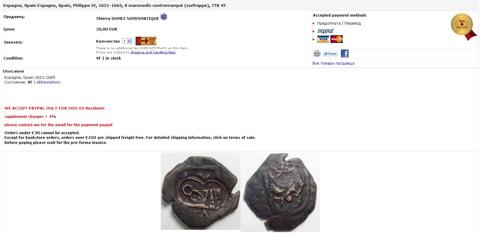17-й век. Номинал в мараведи. Несколько раз переоценённый, о чём свидетельствуют цифры на монете. Сообщение отредактировано Скворцов: Feb 9 2014, 00:55 -------------------- Специализация: джучидские данги от Тюляка до Ибака.