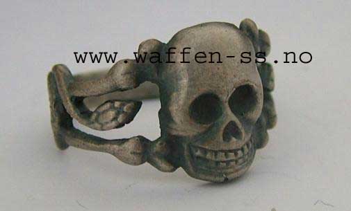 Кстати, - наиболее распространенный, простой по исполнению (в форме фигурного литья) и часто подделываемый сегодня кустарный разрезной солдатский перстень с «Мертвой головой». Помимо прочих особенностей, при подсветке поляризованным светом подделка выдает не характерный для не очень качественного сплава олова с низким содержанием серебра красноватый отблеск, присутствующий для сплавов олова с медью, применяемых для изготовления подделок. Сплавы олова с серебром на оригиналах при поляризованной подсветке выдают слабый голубоватый или голубовато-белый отблеск.