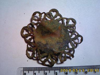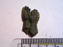 Найдены одной кучкой в земле. Руки и дракон с обратной стороны плоские, корона с оборота повторяет рельеф наоборот. Все три предмета не имеют мест обломов, т.е. являются цельными предметами. Так же вместе с ними найден данный "цветок". Будут ли мнения по данным предметам ? Вложенные эскизы изображений |