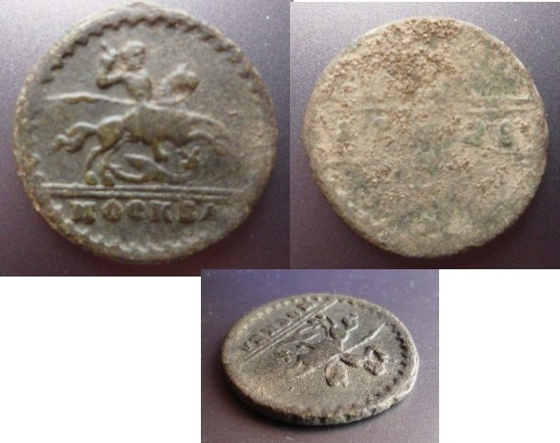 Вот такие две монетки. Прошу помощи в оценке. Монеты лишь сполоснул водой и мягкой щёточкой смахнул песок. На копейке - присохший грунт. Ковырять не стал. Год её - 1728.