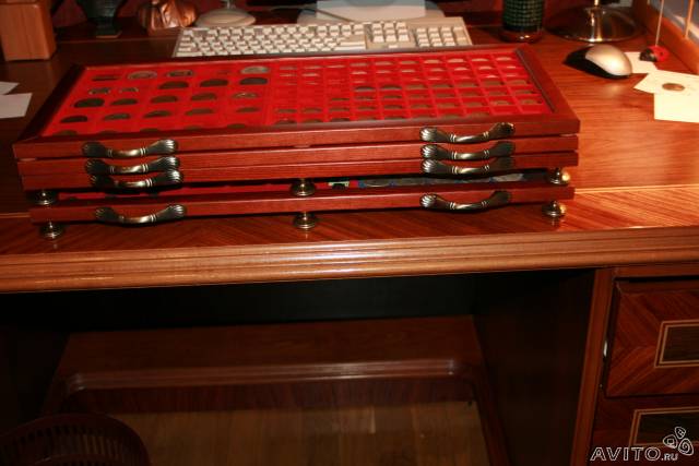МеталлОпластики,ошибся.Размер 66,5 см х 25 см.Дерево +немецкие вкладыши для монет.40 ячеек 33ммх33мм и 24 ячейки 45х45 мм." металлические ручки,6 ножек с фетровыми подкладками(чтобы не царапать стол,полку,нижестоящий планшет