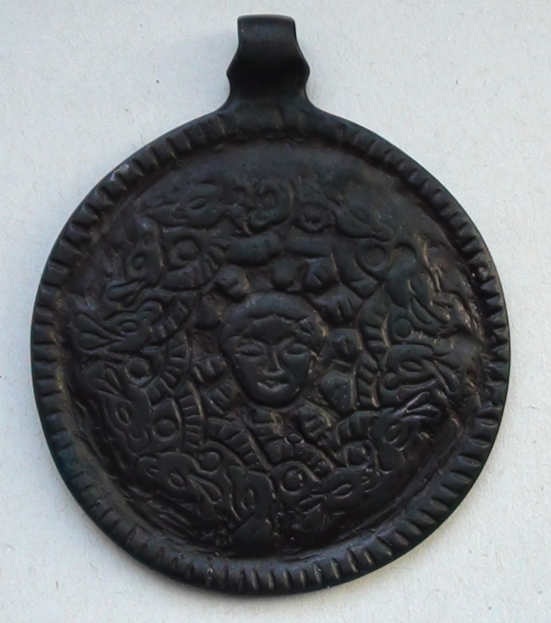 У меня нет особых оснований считать этот змеевик подделкой хотя бы по той причине, что он является единственным в своём роде, если не считать экземпляра, хранящегося в частной коллекции в Киеве и опубликованного в 2010 году Юрием Шевченко. В нашей с В. Коршуном книге этот змеевик отнесен к варианту IIIA2.1.1.b2 (см. с. 100 и кат. № 153). Из публикации Шевченко, где змеевик приведен в ряду прочих, но без масштабной линейки, мы сделали вывод, что он имеет размеры 42х36 мм. Следуя за Ю. Шевченко, мы осторожно датировали его 13 веком, поставив знак вопроса.