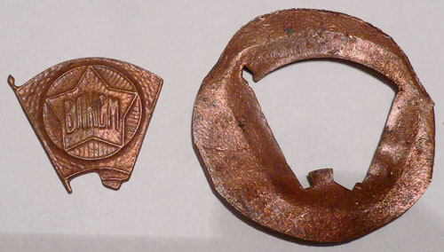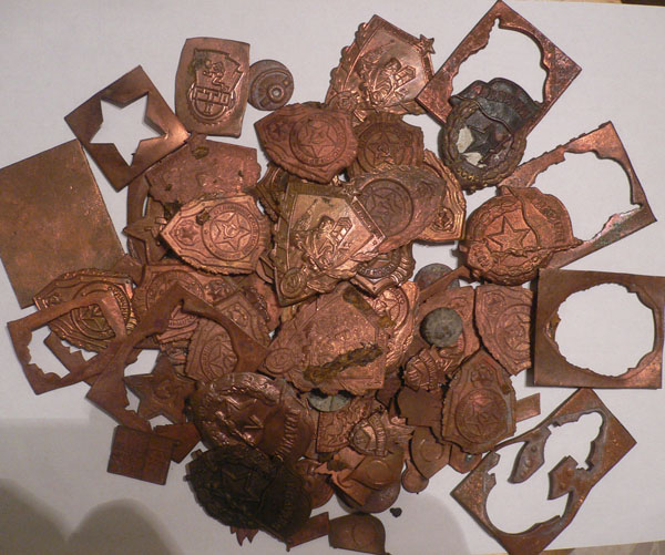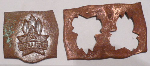 На днях вышел на место, которого рука/нога "нашего брата" ещё не касалась. И находки не заставили себя ждать. Помимо разнообразных монеток и бытового мусора, щедро насыпанного поверх всего местными абр-ми, попался кладик—нычка времён развитого социализма. Как объяснил мне один человек (чей отец таким же образом поправлял семейный бюджет), значки пользовались определённым успехом с середины 70-х до середины 80-х. Но бдительный ОБХСС не спал и тогда умельцы ныкали "всё что было нажито непосильным трудом" куда придётся и без особого сожаления. Вот и на этот раз, чьи-то заготовки значков попались под мою катушку. Чуть больше трёхсот штук и всего нескольких разновидностей. Место пользуется недоброй славой, неподалёку был расположен "вертеп" в старые времена, а сейчас там собираются любители выпить и пожечь металл для скупки. Т.ч. связь времён чётко прослеживается.