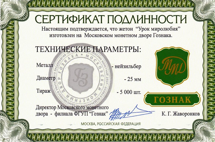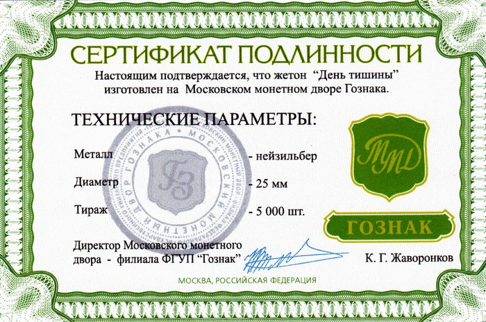 - "2 тарана", - "Урок миролюбия" ПРОДАНО!!! - "День Тишины" чеканены небольшим тиражом 5000шт. на ММД, о чем есть сертификаты. Каждый жетон продается с сертификатом. Гурт насечка. Стоимость любого жетона 500руб. Возможен пересыл по РФ + 100руб. к стоимости лота. Оплата на карту СБ, лот в г.Санкт-Петербурге. Сообщение отредактировано derezel: Feb 9 2016, 18:10 Вложенные эскизы изображений -------------------- Карта СБ 2202.......6670 иных нет, будьте бдительны!!!