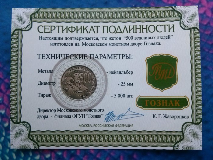 Еще жетон ММД "500 вежливых людей", частный заказ, стоимость такая же 500руб.+пересыл