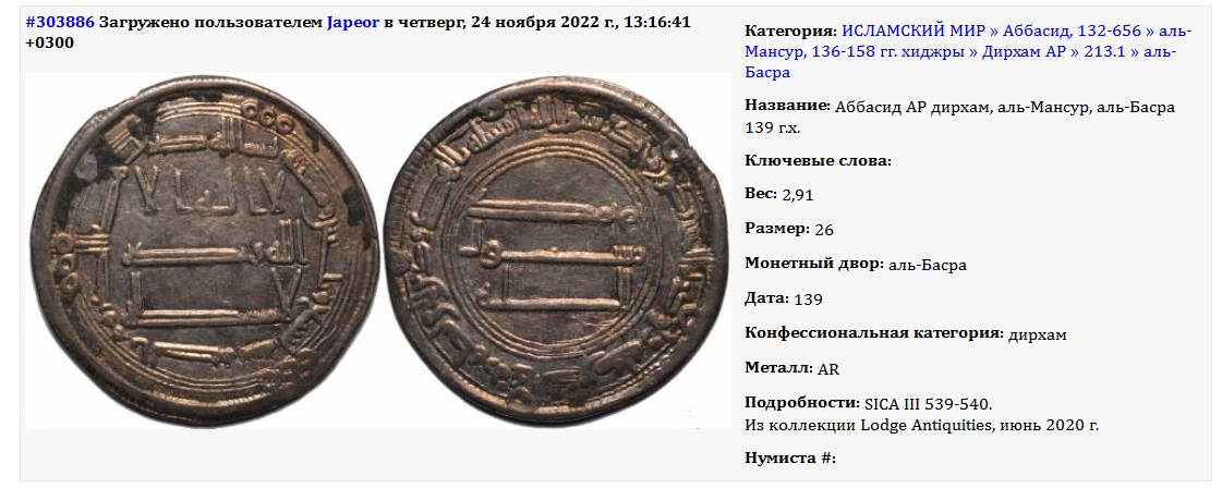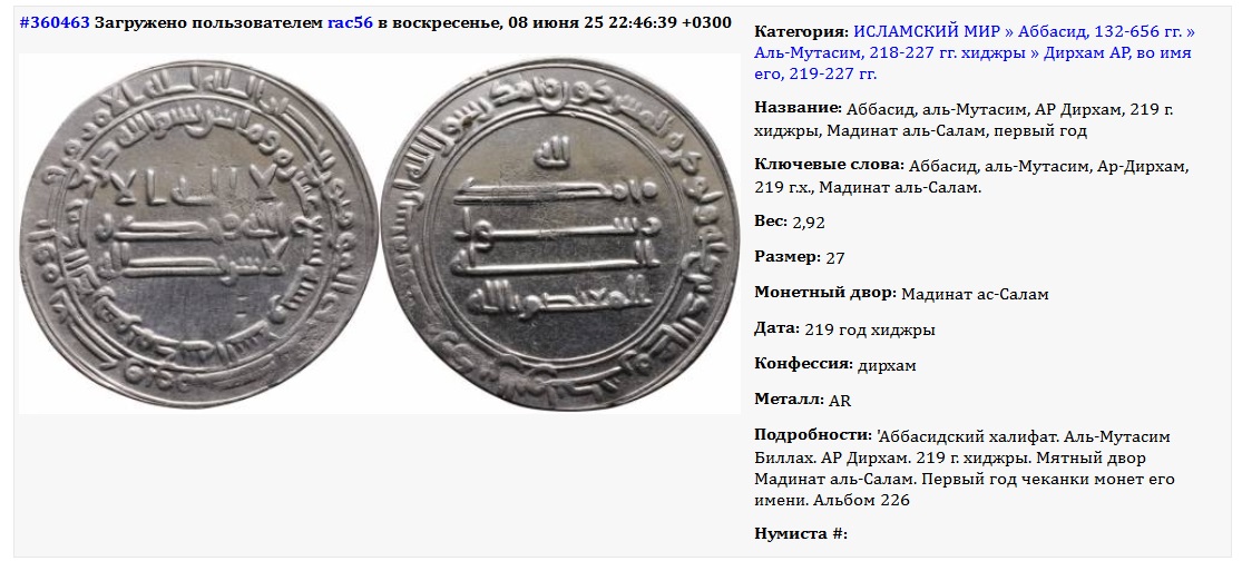 QUOTE(ДмитрийВД @ Apr 1 2026, 10:10) Доброго дня. 1.Аббасид АР дирхам, аль-Мансур, аль-Басра 139 г.х. 2.Аббасид, аль-Мутасим, Ар-Дирхам, 219 г.х., Мадинат аль-Салам. Дмитрий, благодарю 🤝 -------------------- 4 мая 1925 года земля налетит на небесную ось. Точно вам говорю.