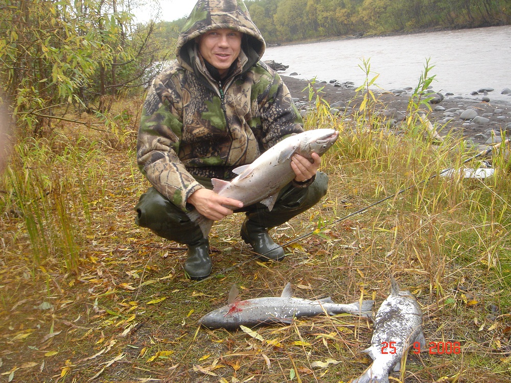 Несколько фото с Камчатки На первом фото с кижучем который только вошел из океана,на втором кобыла Манька,как кошка ласковая и послушная,на третем фото - сохнем после сплава по Налычевой.