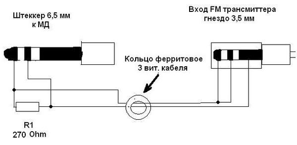 QUOTE(Big62 @ Dec 7 2010, 08:59) Вчера вечером гонял FM трансмиттер Ritmix FMT-900, сначала сильно расстроился, звук полное г..но. Начал штудировать ветку про трансмиттеры, до впайки сопротивлений дело не дошло, за отсутствием оных, а вот про снижение звука в МД вычитал. ИТОГ: 1. Трансмиттер FMT-900 работает с мышом, но звук нужно ставить самый маленький, т.е.1, это касается и звука железа. 2. Приёмник нужно подбирать с цифровым дисплеем, что бы чётко стоять на частоте передатчика, лучше всего вчера работал мобильник Samsung (модель не помню, с двумя симками какой то), обычный приёмник почти не работает, на муз. центре звук тоже не очень. 3. Незначительные искажения присутствуют, но искажается только озвучка (будем работать над этим), пропусков и провалов сигнала нет. 4. Громкость приличная, на мобильнике стояла на 9 из 14-ти. Сейчас занимаюсь монтажом, фото будут позже. Всем привет, у меня хорошая новость по данной теме. На сайте коллег из ближнего зарубежья нашёл вот такой вариант решения проблемы подключения трансмиттера к МД: см схему. уже попробовал - искажения практически пропали, стало возможно комфортно работать с трансмиттером !(У меня тоже Ritmix FMT-900) Использовал сопротивление 270 Ом , и всё прочее по схеме, можно 100-300 Ом, по словам автора некритично (Спасибо Лимонадному Джо из Чернигова, к сожалению не могу разместить прямую ссылку, кому интересно - гуглите трансмиттер резистор). Для защиты от помех - ферритовое колечко с трижды обёрнутым проводом, поставил, насколько действенно - не знаю, но для самоуспокоения пойдёт. Так что с резистором стало значительно лучше. Вложенные эскизы изображений |