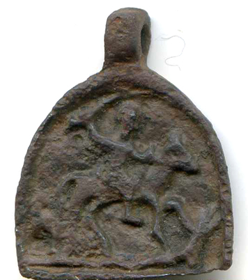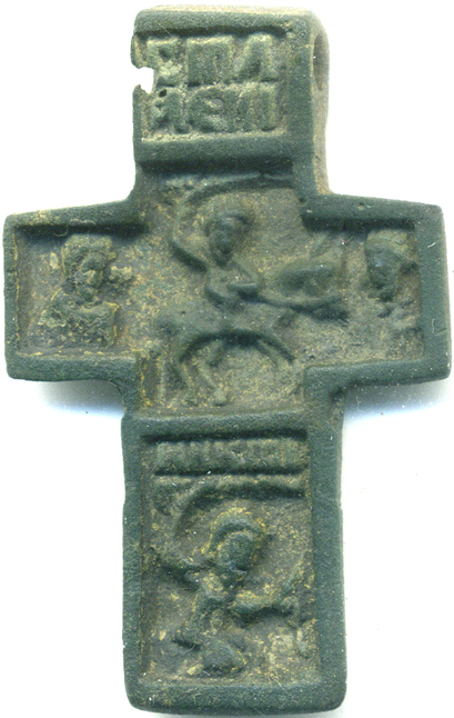Известно, что вел. князья той поры, хоть и отличались амбициозностью, но, тем не менее, были крайне набожны, и врядли бы их изображение появилось на тельных крестах. Св. Георгий, насколько я знаю, чуть ли не с домонгольских времён изображался с копьём, так что он тоже отпадает. Предмет, находящийся в руке у "мистера Икс" с обсуждаемого предмета, на саблю ну очень не похож (слишком длинный + неровная форма), следовательно, это- кнут (см. изображение Никиты на нижнем луче), животное- осёл, обсуждаемый персонаж сюжета- Христос. Круто я всё обосновал? Всем спокойной ночи! |