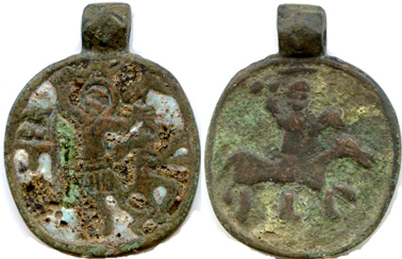 Как правильно было сказано выше, на некоторых писаных новгородских и псковских иконах XV-XVI вв. есть изображения святого Георгия с мечом. И этому есть обоснование в известном сюжете "Чудо Георгии о змии". Как вы помните, святой Георгий спас Елисаву, пригвоздив змея копьем к земле, потом Елисава на своем поясе повела побежденного змея в город, где на главной площади, при стечении большего количества народа, святой Георгий лишил змея жизни, ЗАРУБИВ ЕГО МЕЧОМ (!). По поводу изображений великого князя/царя. Одним из основных атрибутов таких изображений является головной убор - великокняжеская шапка или царская корона. Вспомним борисоглебские энколпионы, где князья Борис и Глеб изображались в великокняжеских шапках. Хороший пример копейки Грозного после принятия им царского титула в 1547 г., когда всадник изображался в трех- или пяти-лучевой короне. На всех ранних изображениях Святого Георгия, он всегда представлен с непокрытой головой (часто с курчавыми волосами). На данном кресте всадник изображен как раз с непокрытой головой. Приведу два примера из металлопластики с изображением святого Георгия с саблей (мечом-?): арочную иконку-привеску со змееборцем с саблей и известную теперь в нескольких экземплярах овальную двухстороннюю иконку-привеску с Никитой Бесогоном на лицевой стороне и с всадником с мечом на оборотной. . Сообщение отредактировано boratinka: Jan 21 2011, 11:52 Вложенные эскизы изображений -------------------- Куплю каменные сверленые топоры и