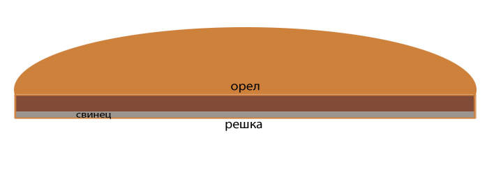 Михаил Максимов, Записки сыщика, Развлечение №30-й, Том 2, 1859 г. Рассказ 12 Господа, товарищи...покажите как в этом случае запиливали края? Уверен на 90%,даже на 100, что никакие незаметные и даже заметные запилы сильно не изменят вероятности выпадения орла. Фантазии на тему монеты падающей всегда орлом вверх: Что бы добиться такого эффекта центр тяжести должен быть сильно смещен в сторону решки. Например, 1/3толщины монеты - медные (родные) или свинцовые, а 2/3 легкие, допустим из дерева или сургуча покрытые сусальной медью. Монетой со смещенным центром тяжести не играли постоянно, а пускали в ход, когда игра была в разгаре и ставки достаточно велики. Вот тогда еще одна версия - запилы и постоянно затираемый орел – это демонстрация того что монета не поддельная. Но реально ли сделать такую подделку? Сообщение отредактировано Печкин: Sep 10 2011, 01:36 Вложенные эскизы изображений -------------------- Куплю рыболовные крючки, блесна и пр. старше 100 лет