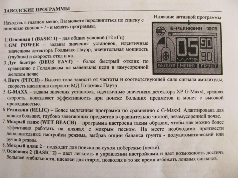 Здесь на форуме представлены тесты разных версий Деуса, не могу пока достигнуть таких же результатов по глубине как представлены в тестах. Прошу подсказать по настройках, копаю в основном по Киевской Руси, по ЧК, по КК, Скифы И.Т.Д. При этом нужно значительная глубина обнаружения, залегающих объектов. Это не первый мой прибор, да и махаю приборами уже три года. Прибор мне нравится, прибор очень умный. Даже за не большое время нашел много монет таких как чешуя, копейка Ивана Грозного, античные монеты. Прилагаю фото копию программ которые установлены заводом изготовителем в моём приборе. Очень буду благодарен спецам за подсказку, по настройкам и правильности выбора программы, в моей специализации. С ув. |