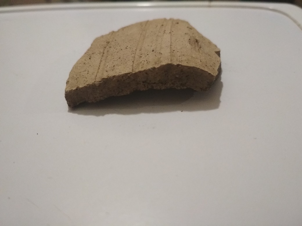 Здравствуйте уважаемые форумчане, подскажите пожалуйста по периоду. Толщина стенки 6мм, свежий излом на фото. Сопутка куски светло-розового гранита размером сантиметров по 10, толщиной сантиметров 5. Северо-запад МО. Всех с ув. и спасибо за помощь.