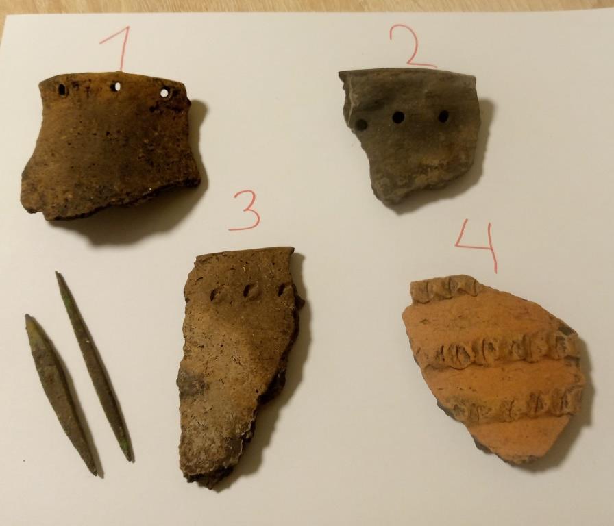 Здравствуйте. вот интересует кто жил в моих краях - археологическая культура, век. я так понимаю по керамике можно определить. Все четыре фрагмента с одного места - распаханный луг возле речки небольшой. Все разные. интересует это временное наслоение или одна культура просто разное исполнение орнамента горшков. И два бронзовых или медных вытянутых изделия там же найдены. Друзья говорят это проколы или пронизы для шитья. Спасибо .
