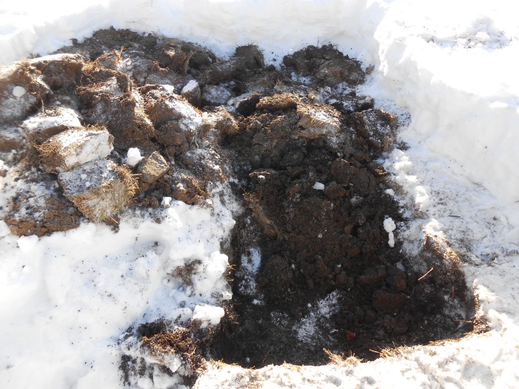 Кирка понадобилась там где была печка . Где под землёй много кирпича , на земле много крапивы сухой , там промёрзшия земля оказалась под 10-15 см .
