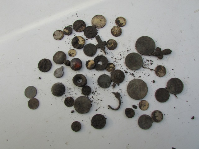 Решил для начала поискать лопату в реке которая ее поглотила на прошлом посещении и снова пошарить по верхам фундов,так как это приносило не плохой улов в прошлые разы.Речка спала и лопата была обнаруженна и спасена. Теперь их две и это радовало,но позже оказалось,что приехал я с дохлой штаткой. Бывает и кислый поиск. |