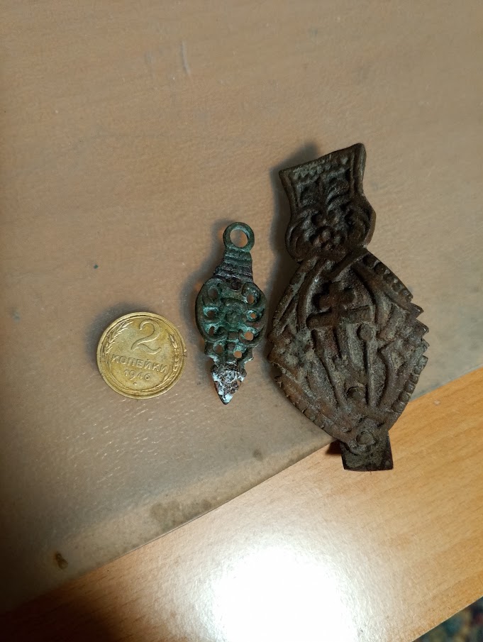 Еще интереснейший мне пока не понятный факт где то в паре метров от этого места была концентрация цветных сигналов (пряжка монета сережки пуговицы) было это все на третьем штыке такой мягкий слой как гнилое дерево с высокой концентрацией битых крупных кусков черной керамики редких осколков толстого битого стекла как будто в тонком блестящем на солнце налете и этот слой шел еще штыка на три потом была твердая земля это все продолжалось где то на полтора метра вширь и в длинну дальше с разных сторон песок и сигналов в т ч железа (кованые гвозди практически нет) и сопутки вот и думаю стоит ли песок выкапывать глубже