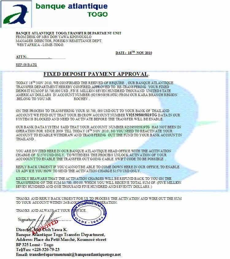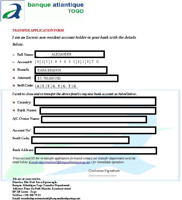 Все на мое имя зарегистрирован депозит и я должен перечислить все деньги на свой другой счет по заявлению (_______1_APPLICATION_FOR). Заявление причем нужно было отправить по адресу transferdepartmentunit@banqueatlantiquetogo.net, который имеет домен banqueatlantiquetogo.net официального сайта банка .