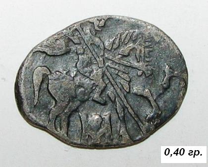 Вроде Михаил Федорович. Вес 0,40. Это может быть ярославский монетный двор с подражанием московскому двору судя по пониженному весу ? Каталогов подробных у меня нет, и что там за буква или загогулина перед мордой коня? Есть ли каталожный номер? Сколько может стоить? Спасибо ! Вложенные эскизы изображений -------------------- С уважением, В.В.
