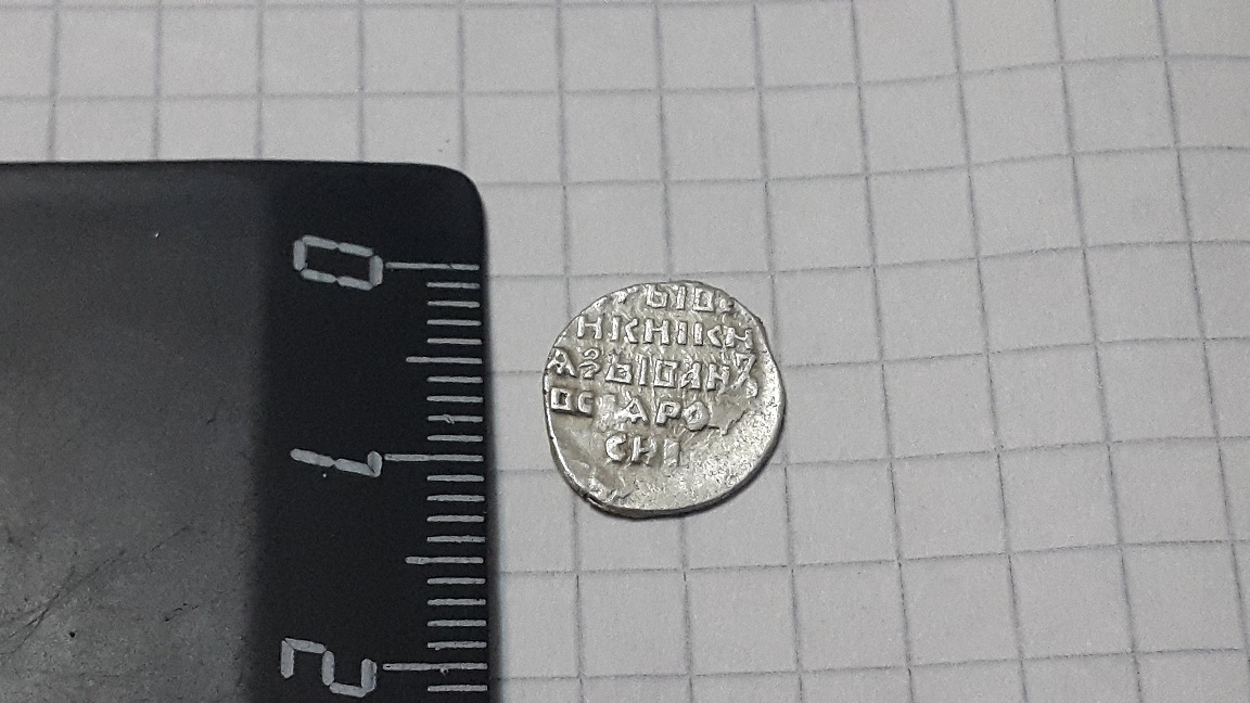 Добрый вечер. Прошу вашей помощи в определении двух чешуек. Одна монетка стандартная,но не могу разобрать чьих она буде. А вот вторая. Тут основной вопрос. По массе и размеру в два раза больше стандартных копеек, всё что самому удалось прочесть это нижние две строчи "всея" и "руси"