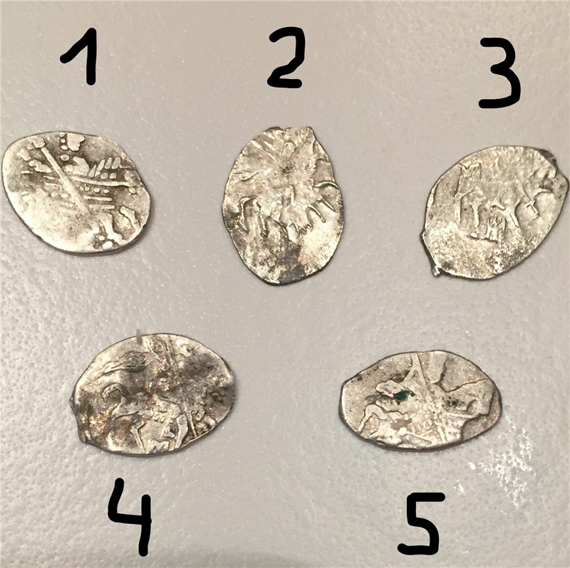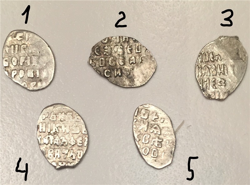 QUOTE(RODICHH @ Oct 13 2017, 21:22) Добрый вечер ув.коллеги,будьте так добры,помогите с определением монет.Заранее благодарен. 1-Новгородская копейка Бориса Годунова, 2-копейка с именем Ивана Алексеевича совместное правление с Петром 1, 3-копейка с именем Петра Алексеевича совместное правление с Иваном 5, 4-копейка Михаила Федоровича, 5- копейка Алексея Михайловича |