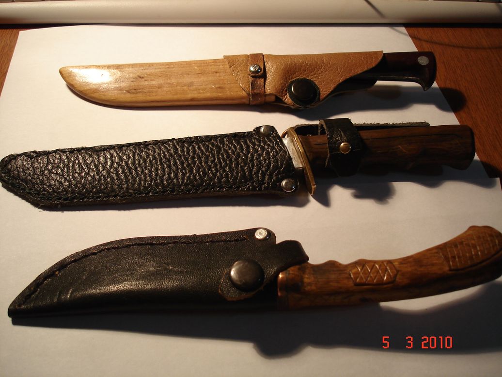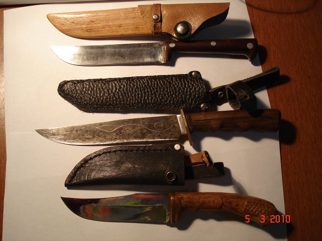 Посмотрел,много красивых да сувенирных а чтоб обычный,рабочий который не жалко и подточить мало. Вот мои,которые остались.Теряю я их а с этих только ножны были потеряны,вот этой зимой подготовил к сезону. Самый маленький полностью сделан мной.Изготавливал как шкуросъемный да сталь вроде хорошая,но по шерсти не ахти. Кыргыз, товарищ привез.Хоть и не нержавейка а сталь хорошая.Я им свинину рубил на холодец(топора дома не оказалось)подставлял и свеху молотком,лезвие выкрошилось немного,было шире мм на 4-5. Большой, откопал,одно лезвие,хвостовик удлиннил, ручку сделал.В стали не понимаю но вот из чего надо было делать шкуросъемный,жало держит, акуеть. Простинькие но помошники отличные Вложенные эскизы изображений |
