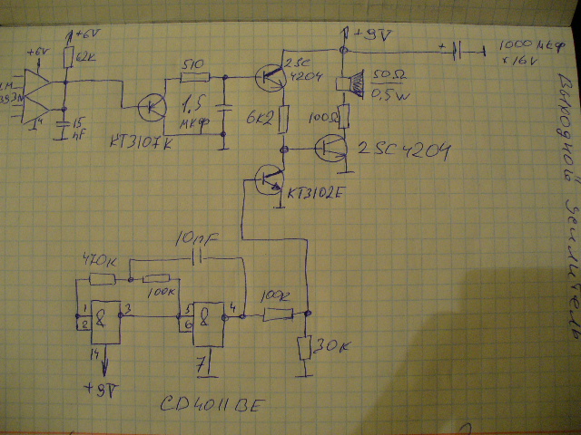 QUOTE(flagman @ Mar 21 2010, 11:30) Ятаган, Лева, пролейте свет на Терминатор-4, ночью запускал, что-то вроде видит, но не так как надо, по порядку: 1. Я собирал Т-4 транзисторный вариант с транзисторным звуком, так вот, первый (входной) транзистор усилителя - 3107к - не открывается ни под каким соусом, коллектор у него на земле, база - на выходе компаратора, а эмитер через 510 Ом подсоединен к с4204, отсоединял даже от схемы, какой потенциал на вход не подавай - молчит звук вообще...... такое впечатление, что к точке соединения 510 Ом и 1,5мкф надо какой-то резистор добавлять и на плюс его, схему брал ту, что давалась рукописная на листике....... там ничего не забыто случайно??? пробовал подключать мимо входного транзистора прямо на 4204, звук работает, но так же неправильно все-таки, че за фигня???. 2. При установке некоторого порога на компараторе, через 10-15 минут прибор начинает давать постоянный тон, будто уходит порог сам собою.... с Тройкой такого не было замечено даже на разряженой батарее..... 3. При любых попытках отсечь хоть что-то (феррит, железо, цвет) - ничего не получается, в лучшем случае при вращении переменников просто вдвое уменьшается чуйка на то или иное, а щелчков отсечения вообще нету, или например дает звуковой сигнал на чернину точно в центре катушки, а на монету после прохождения центра (противофазу дает)...... че за фигня? такое впечатление, что все траблы связаны с использованием двухполупериодного синхродетектора, как ни вырезай, все равно пролазит звук с противофазы..... Сфоткайте схему варианта выходного усилителя звука на транзисторах и представьте. Я сам какуюто давал с ошибкой, не хватало одного резистора. При перерисовке недосмотрел, может вы по ней и собираете. Сообщение отредактировано ятаган: Mar 21 2010, 12:00 -------------------- Жаль, что товарищ Сталин был милосердным очень.