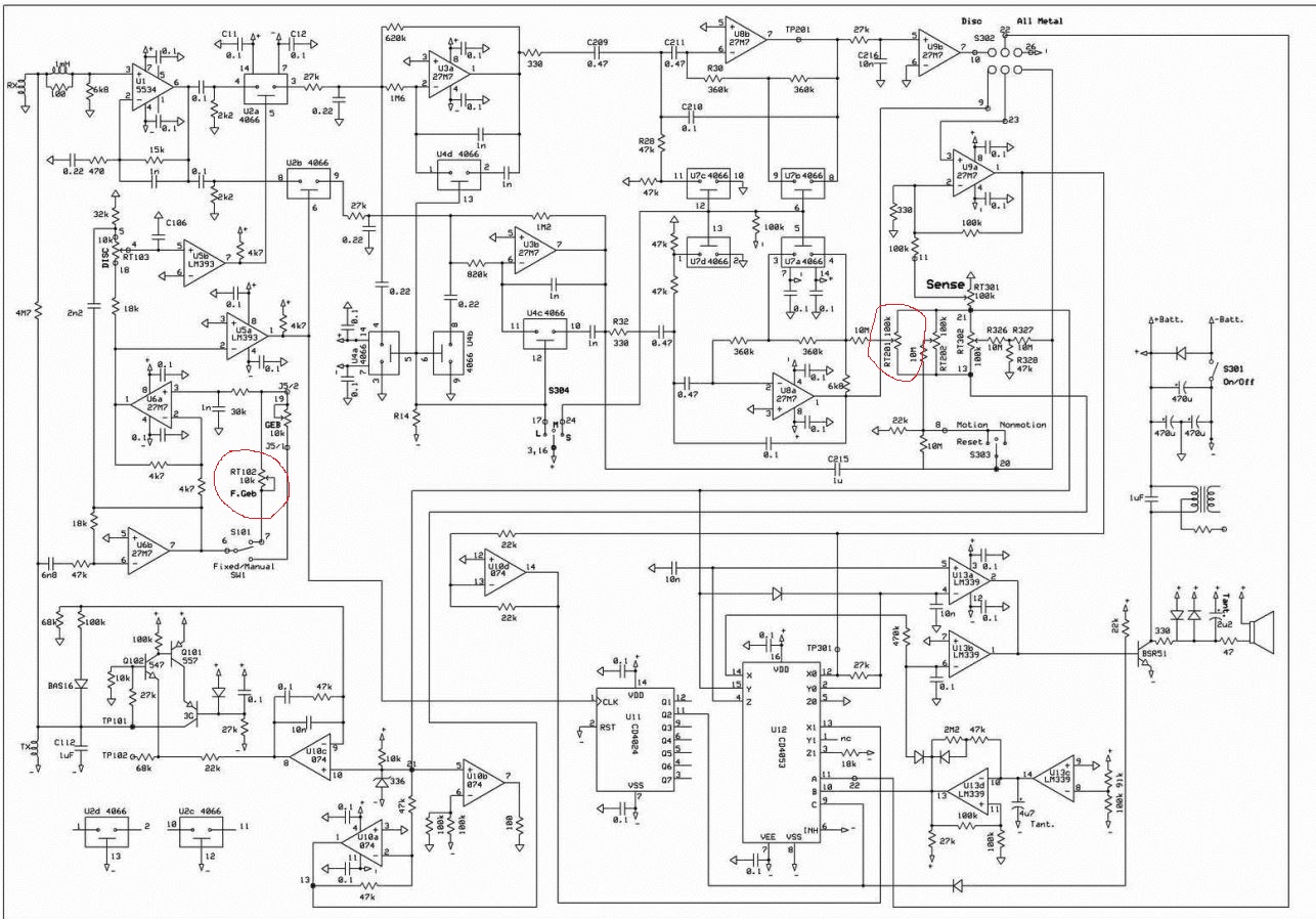 QUOTE(GSL @ Jan 29 2018, 13:53) Несколько лет назад занимался этим прибором. Полной схемы нет, но основное есть. R102 - это подстройка земли в фиксированном режиме (авто). R101 - это на 80% (R201 по схеме) - подстройка усиления канала все металлы. Если нет нужной аппаратуры лучше не трогать иначе скрутите дискрим. R105 - не знаю. Судя по печатке идет напрямую на 26 pin разъем. Ага, спасибки, понял. |