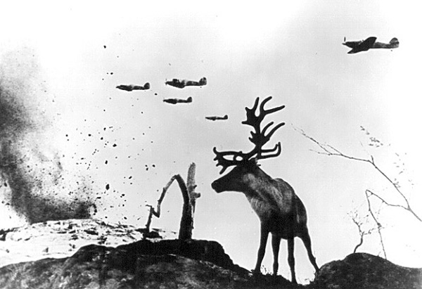 Немного в продолжении темы, прошу аналогичной помощи, т.е. определить тип и принадлежность авиации. Для справки фото военных лет, сделанное в г.Североморске (Мурманской обл.), так же в Североморске находился Советский аэродром, что наталкивает на мысль, что самолет советский, не исключено ИЛ-2. Но сомнения вызывает дымка рядом с оленем, словно бомбежка немецкой авиации, поэтому интересно стало, была ли немецкая авиация в небе над Североморском, с учетом того что сухопутные подразделения Вермахта не дошли до Мурманска, т.е. и в Североморске сухопутных операций не было. Зараннее спасибо.