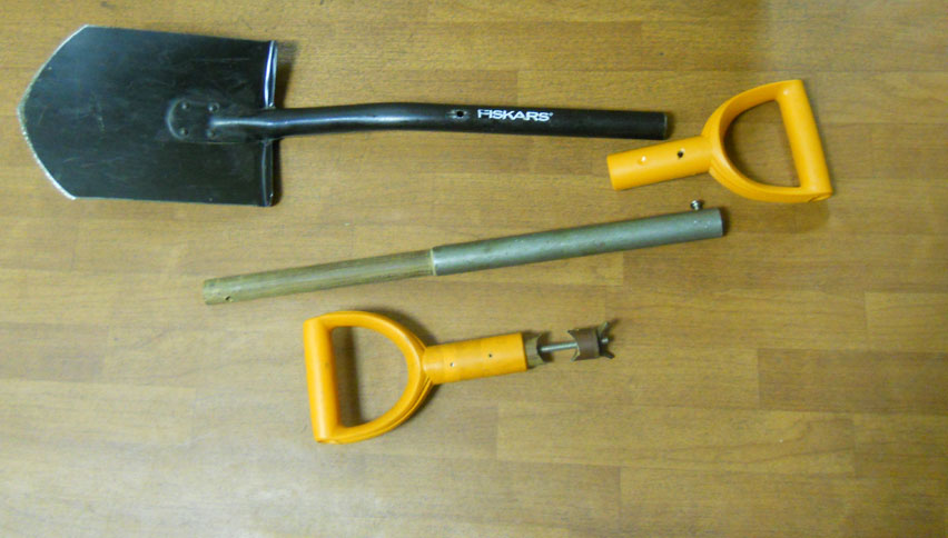 Пусть нас называют сектантами, но для меня это вопрос здоровья. Травма позвоночника, 6 грыж, 2 травмы руки. Не могу долго копать штатным инструментом. Идею подсмотрел тут на форуме. Варить металл сразу отказался, так как удобная лопата нужна и по блинам и в поле и на шурфе. Поэтому модификаций много, я выложу основные. Всё собирается-разбирается за минуту максимум. Черенок тосненского фискаря 32 мм в диаметре (28,5 мм внутри). Вот это был основной размер.