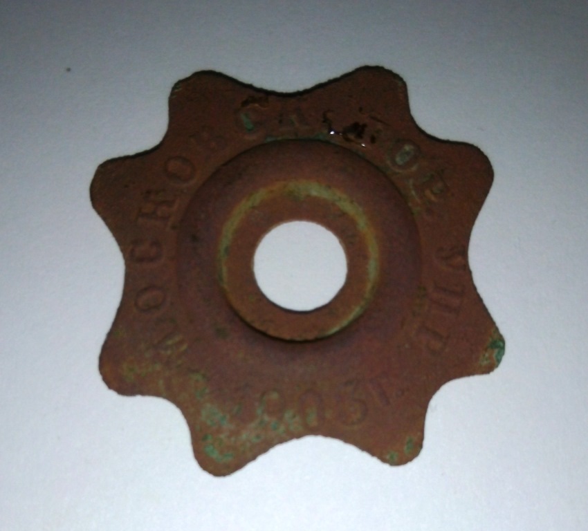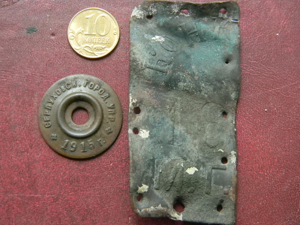 Продолжу темку.Находки с Липецкой области,были в пяти метрах друг от друга.Медную пластинку хотел в шмурдяк забросить,но когда по Серпуховскому жетону инфу искал,попал сюда.Почистил ее и увидел старое подобие регистрационного знака.Видно,что к конке гвоздиками было прибито.на местном форуме мне втирают про собачий жетон(это про 1915),но он точно не собачий,скорее -лошади или ее владельца.
