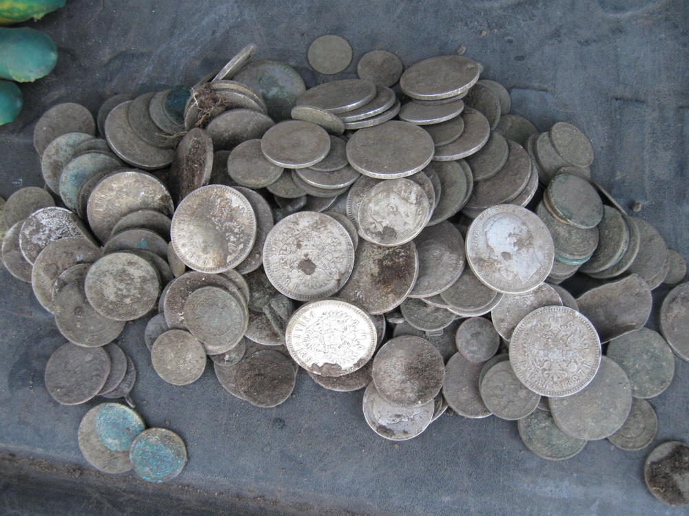 Приехали в деревню,посмотрели по восемнашке где раньше стояли дома,на местах сегодняшних огородов,они как раз и находились.Разбрелись по огородам,благо на них присутствовала керамика от Петра до Советов.Как и везде, эти места выбиты неплохо,редко попадались деньга и полушка.Проходив полдня,подходим ближе к одному и жилых домов,навстречу выходит бабушка с вилами,ну думаем все-началось(не даст ходить по своему огороду),а нет, подходит и говорит-а вы ребятки у меня с боку дома походите,я там как-раз траву скосила,богатый сосед у меня был.У друга первый сигнал-капок и в отвале и в ямке показались рубли.Мы дружно зашурфили этот клочок земли,сверху было Николаевское серебро,от 5 коп.,до рубля. Пробивая в очередной раз шурф,на самом краю ловлю монетный сигнал.Копаем,и на разрезе земли показались стопки Николаевской меди.Вот собственно и весь рассказ.