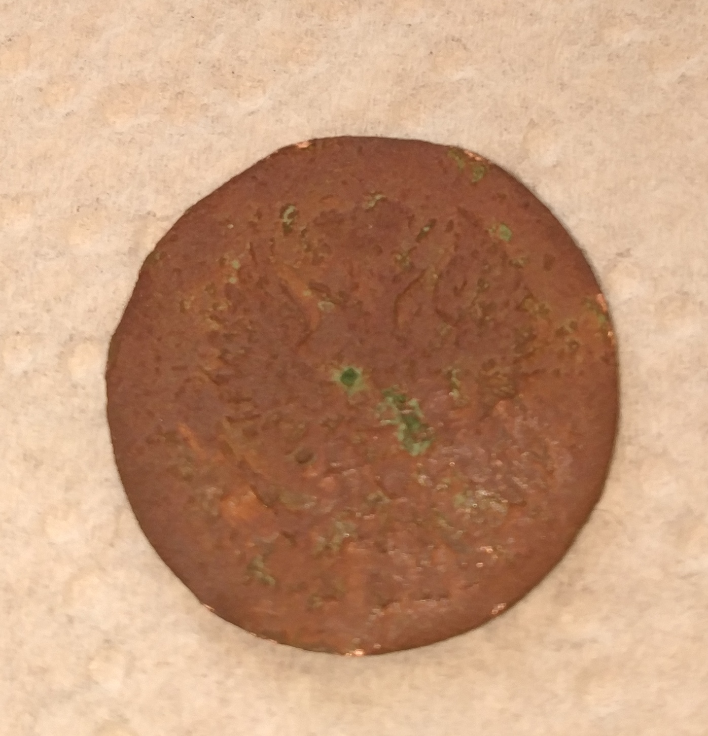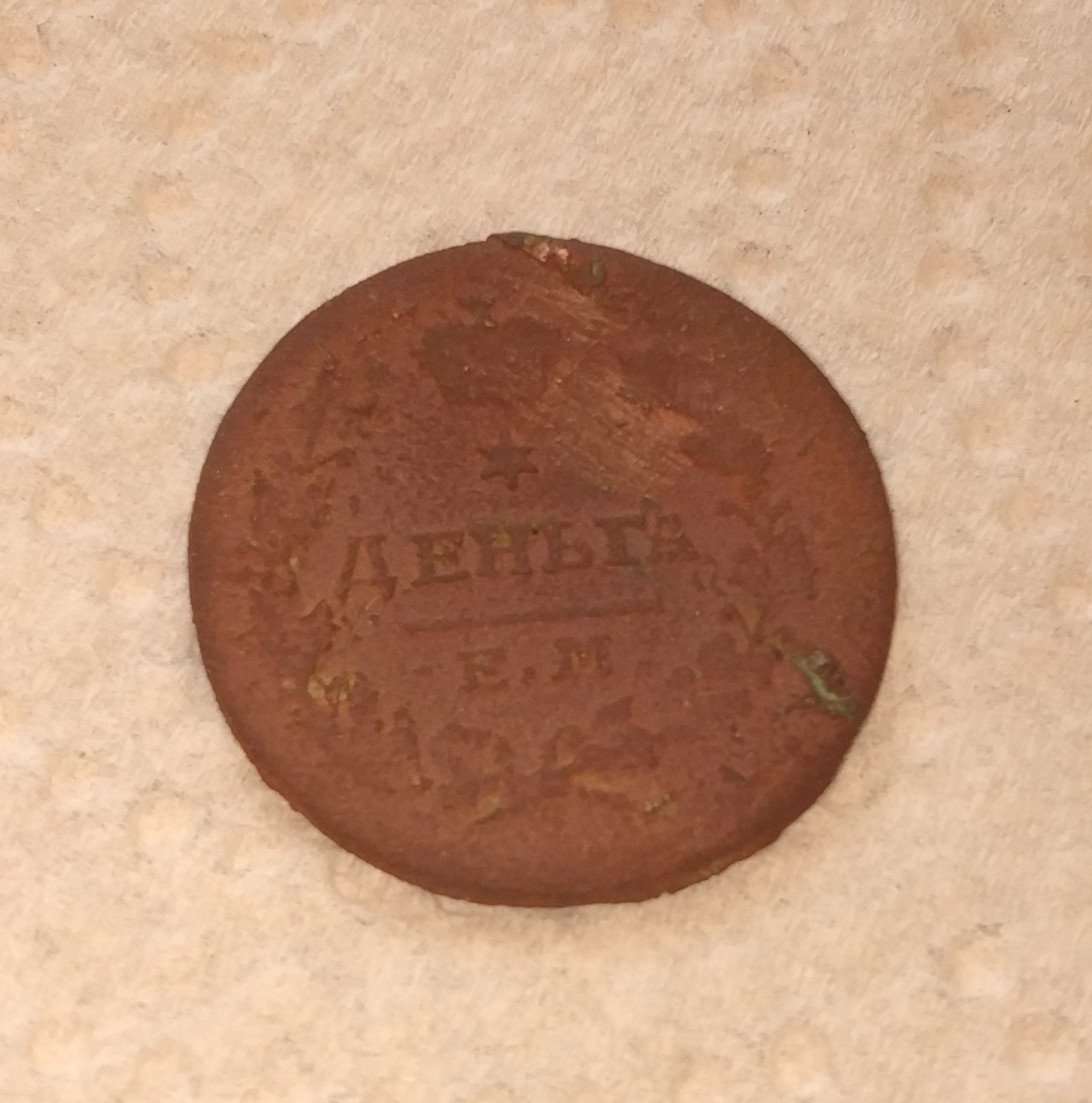 Поле монеты корродировало неравномерно, в основном ровное, местами небольшие каверны с хлоридом (при тесте в камере покрываются капельками воды). Если при расчистке непрочной поверхности частично перешедшей в соли нужно закреплять смолой, чтобы сохранить рельеф, и монета будет вся рябая от разноцветных окислов, то здесь основная часть поля ровная, в куприте, с мелкими зелеными точками - кавернами. Как с точками бороться? Есть мнение, что надо консервировать БТА. Но точки останутся. Красить? Если да - то чем? Или удалять хлорид до победного и оставлять каверны? Или замазывать доделочными массами цвета куприта? |