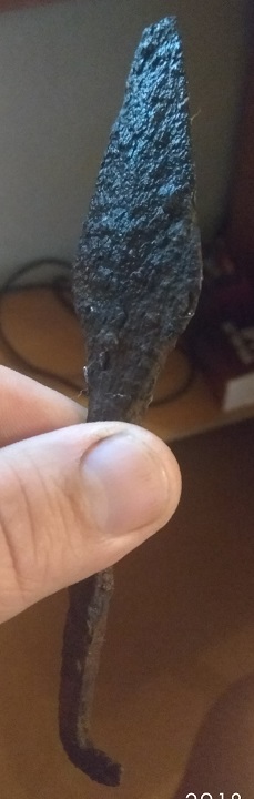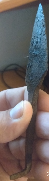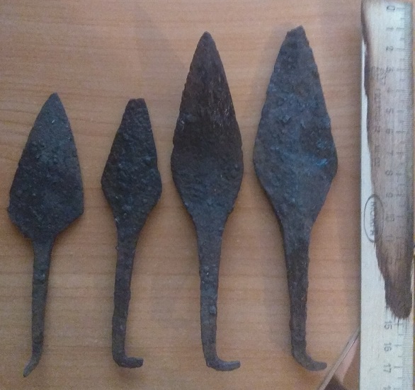 Наконечники охотничьих сулиц. Охотничьими считаю потому, что неоднократно встречал подобные в лесу, в местах и близких и удалённых от ближайшего жилья. Да и форма у них всегда достаточно простая, просто плоскость без какого либо заметного усиления или утолщения железка. Некоторое время назад (год-полтора) несколько подобных выставлялись. Оценили их в 300-400, а ушли около 400-700 за штуку. По времени видится 9-15 век. Загиб черенка для фиксации в древке с последующей обвязкой.