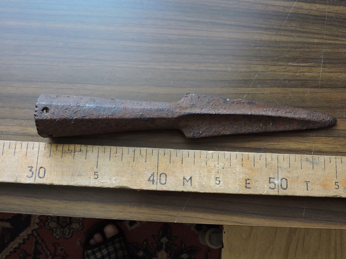 длинна 24 см . ширина входа черенка 3см. найдена граница Воронежской и Волгоградской области. сопутка кованые гвозди и так обломки металла .