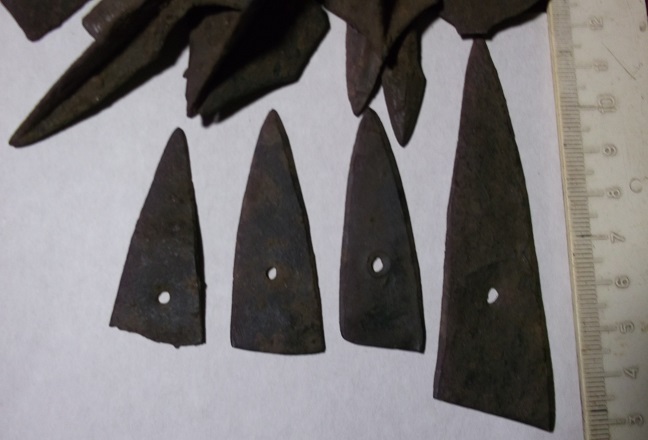 Острие у всех обоюдосторонне оббито, или заточено. Скошенные низа тоже оббиты, как для захода в расшепленное древко стрелы. В каждом есть отверстие. Очень напоминают простейшие наконечники стрел, но такой формы я не встречал. Подскажите пожалуйста это наконечники, или что-то другое? |