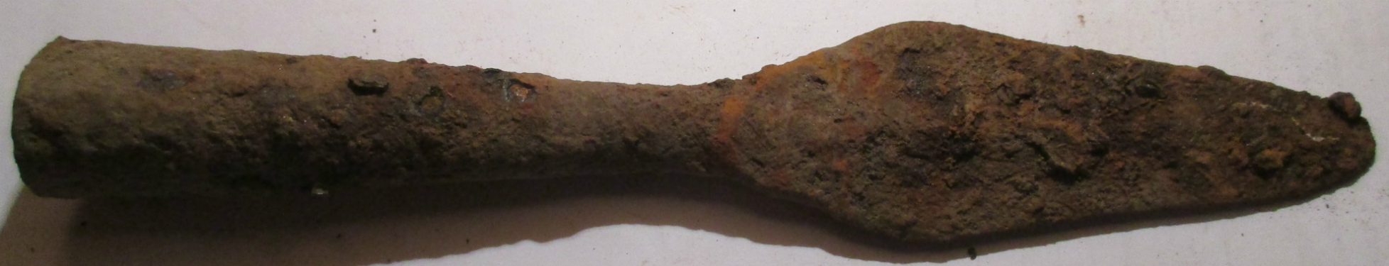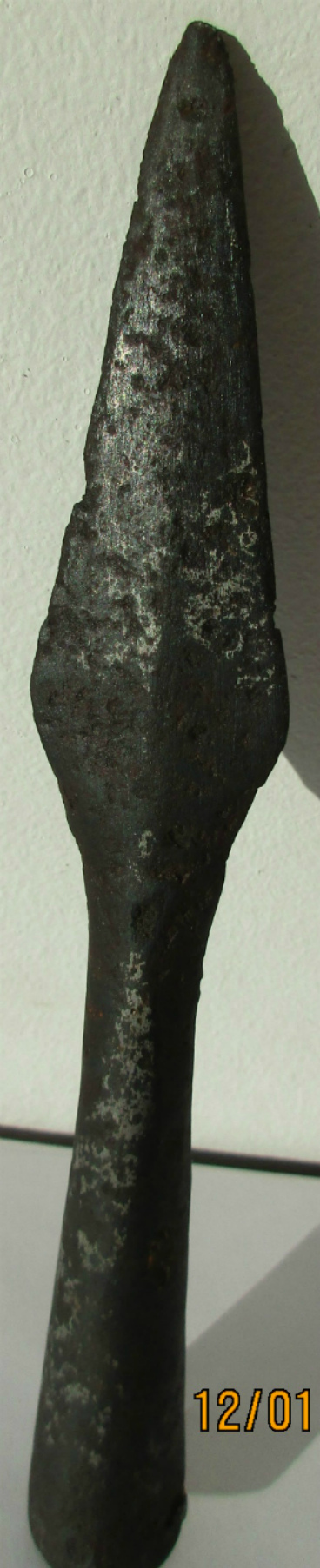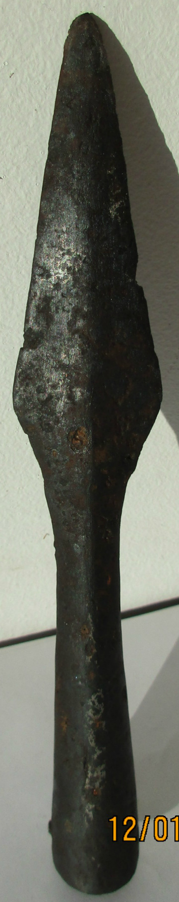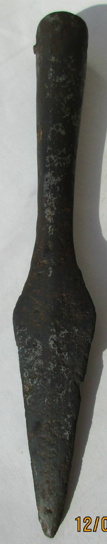 Был замечательный наконечник копья. С такими кольцами на втулке проходил по моему всего один раз давно. Но утраты убили всю цену. Предположу ценник около 1000-1500 р. Дешевле рука не поднялась бы отдать, а дороже вряд ли купят, если только дополнить коллекцию необычной втулкой. Думаю конец 2го тысячелетия до нэ.