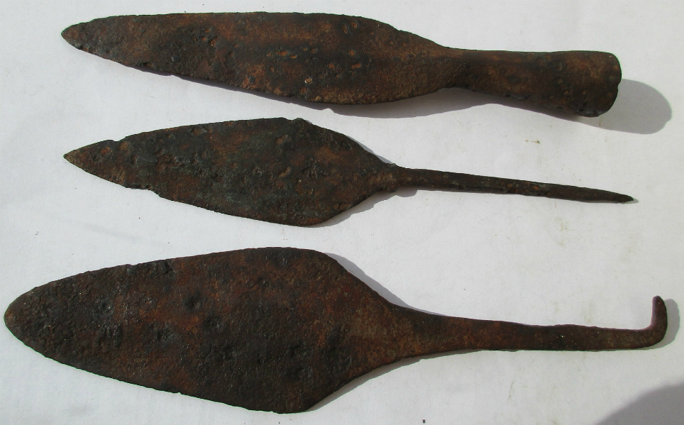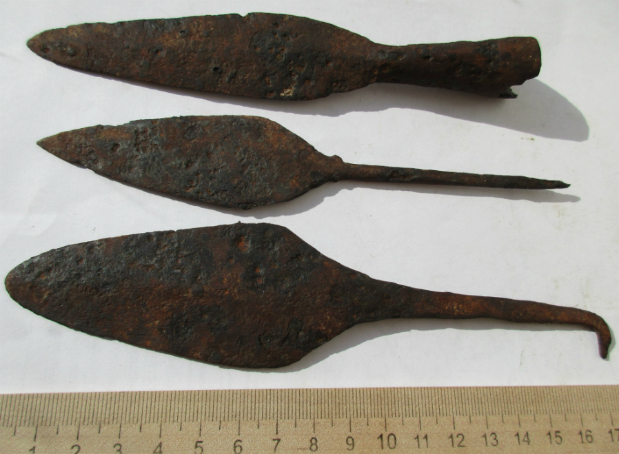 Уважаемые форумчане прошу помочь определиться с периодом,принадлежностью данных наконечников и оценить их,подняты на терр. Курской обл.Сверху-вниз ,первый:вес 70 грамм.,длина 15 см.,второй: вес 28 гр.,длина 16,5 см., третий: вес 61 гр.,длина 17,5 см. Наки слегка зачищены,крепкие. С уваж.