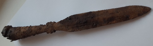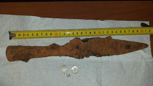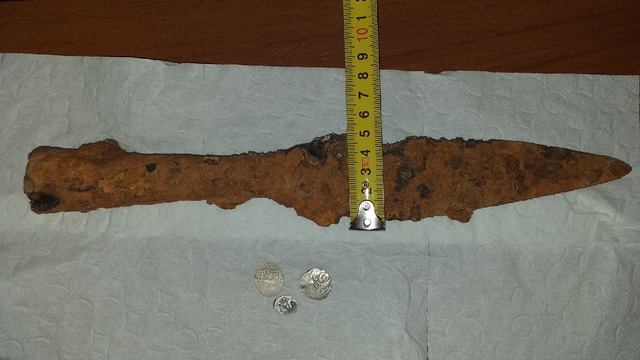 Наконечник копья 10-12 век, скорее к дирхемам, в таком виде около 200 р, может чуть в +. Если адекватно привести в порядок 500-700.