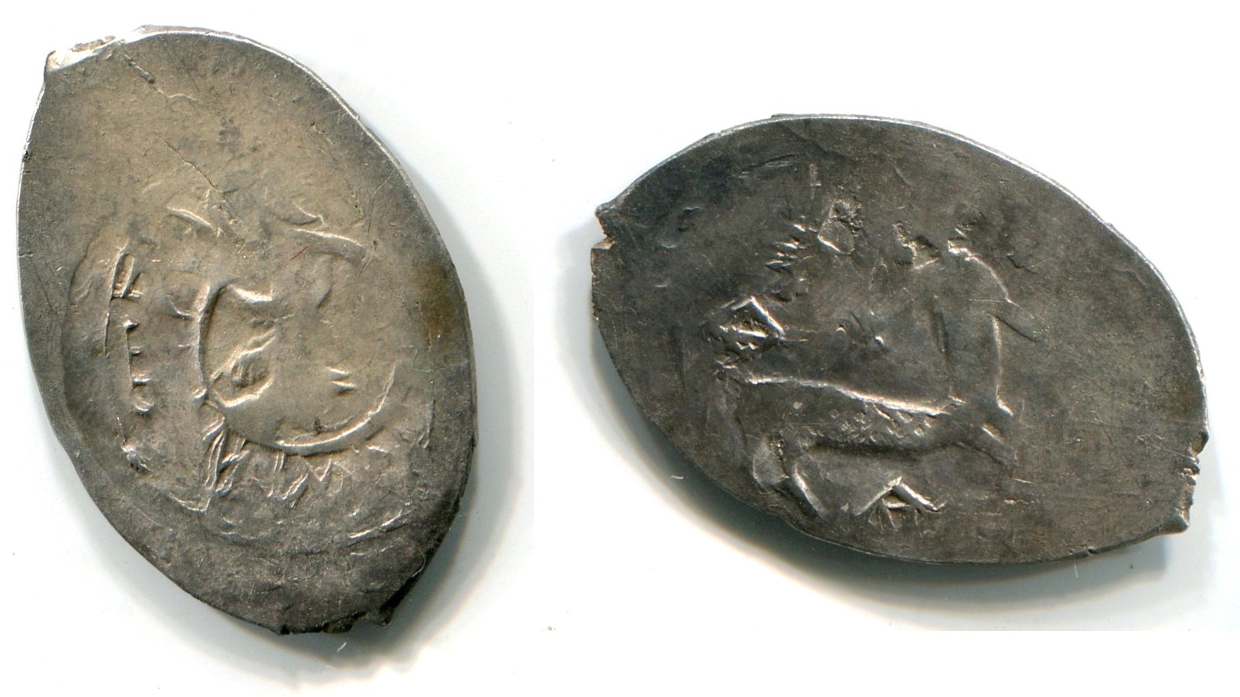 Нечастая денга князя Петра Дмитриевича Дмитровского первого десятилетия XV века. На лицевой стороне - голова в короне в круговой надписи с именем князя. На обороте - кентавр с мечом и кубком в руках, вокруг - квадраты с ромбами внутри. Крупная монета в хорошем для этого типа прочекане, без следов обращения.
