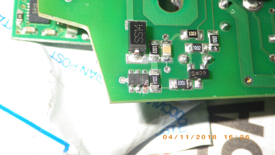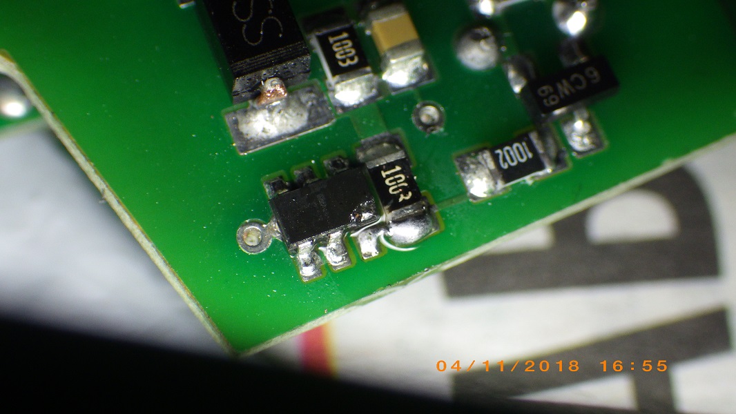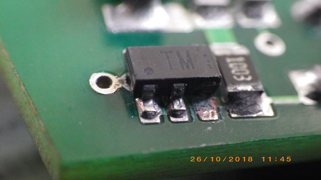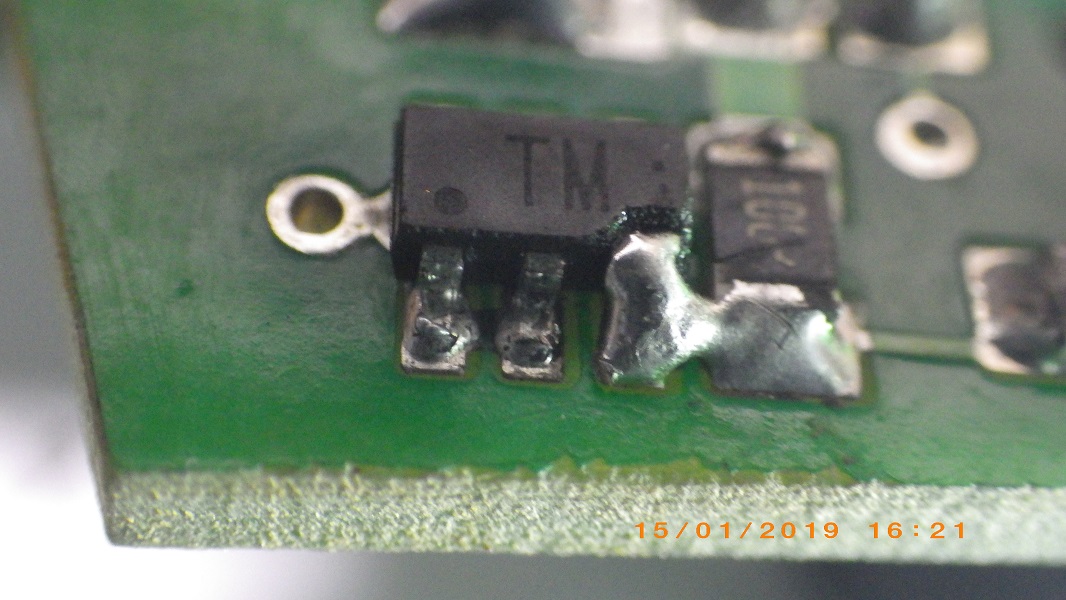 Ну и ежели опять что-то в блоке навернётся не тратить время на вызвание дорожек и не фантазировать по работе той или другой детальки. На этот раз откуда-то взявшийся конденсат в блоке сожрал вывод на ис ТМ. В инете, по этой микросхеме, ничего не нашёл, на замену такую же- тоже по 00 и никто про неё не знает... Хотел сначала "скинуть" эту часть схемы и свою замутить, но после, репу почесамши, с извратом, её же и "подлечил" |