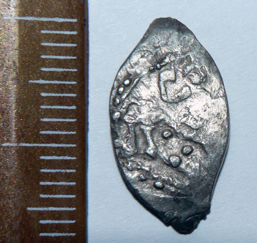 QUOTE(99999 @ May 10 2009, 23:25) Всем привет,попалась загадочная чешуя -размер 12 на 8 мм, сильно тёртая, подскажите кто знает . Обмылок Московской денги Василия 3. Видна монограмма оборотки не вижу. ИМХО, что-то из серии №№ 33-35 по Зайцеву |