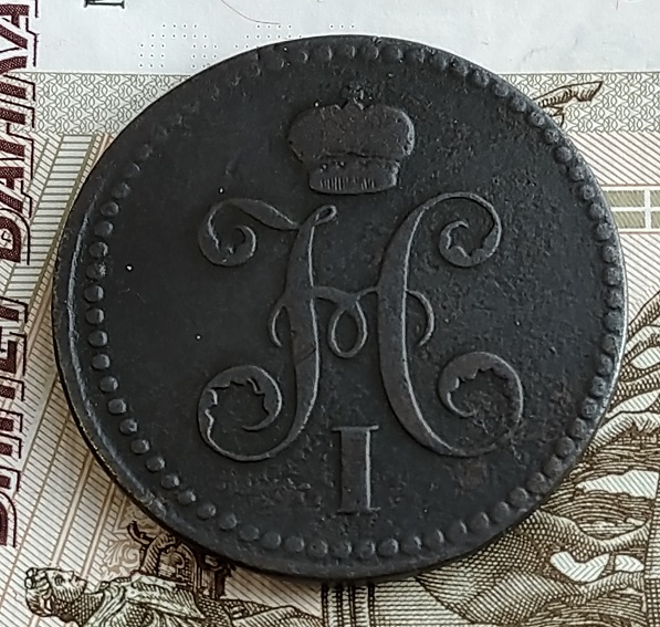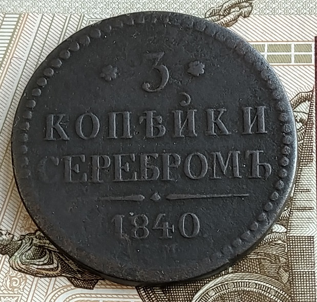 3 копейки 1840 года, буквы ЕМ, вензель украшен, буквы "ЕМ" большие - по мне вокруг 450 р