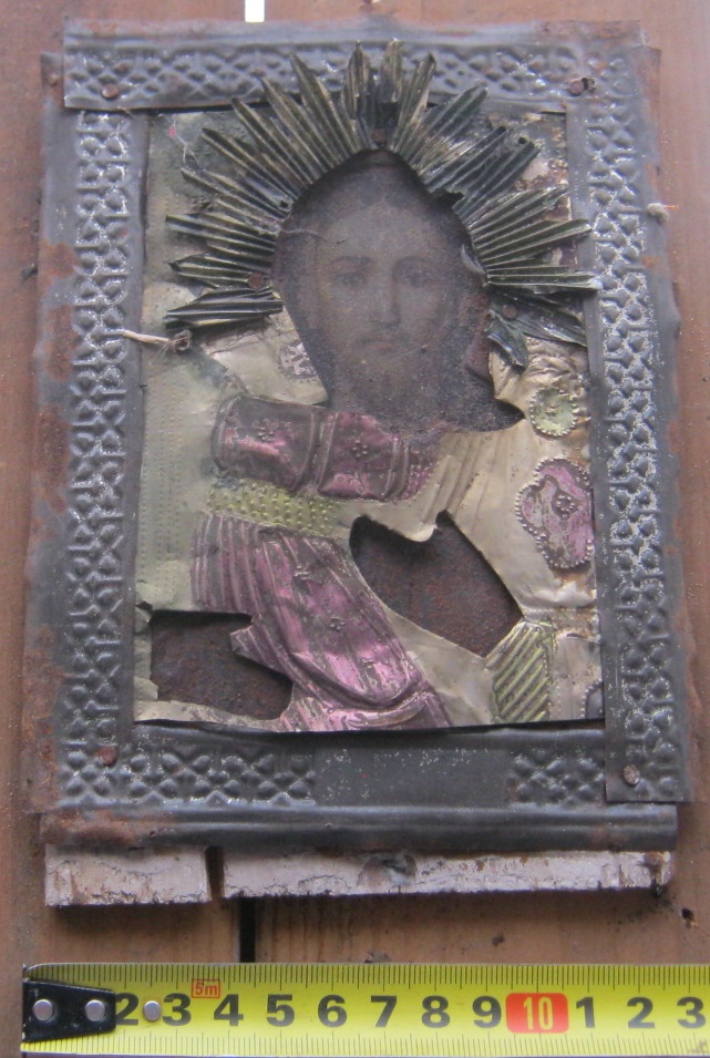 Спас, выполнен на жесте (Жако), проржавевший, с прибитым Народным Творчеством (от чего попало), 19в.